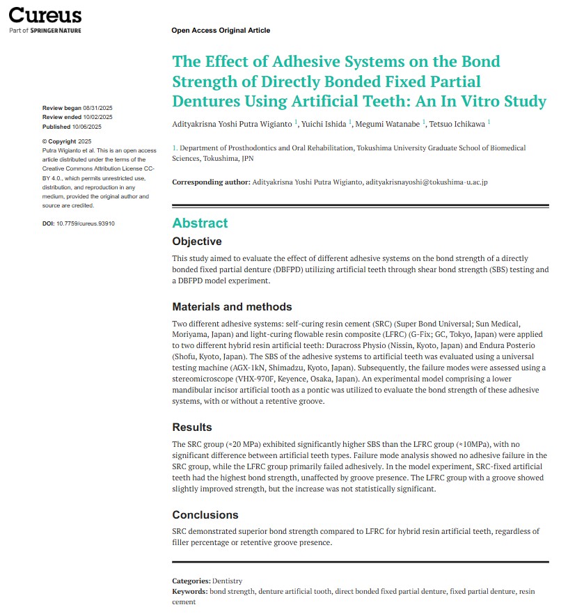特任研究員Adityakrisna Yoshi Putra Wigiantoの論文「The Effect of Adhesive Systems on the Bond Strength of Directly Bonded Fixed Partial Dentures Using Artificial Teeth: An In Vitro Study」がCureusに掲載されました。